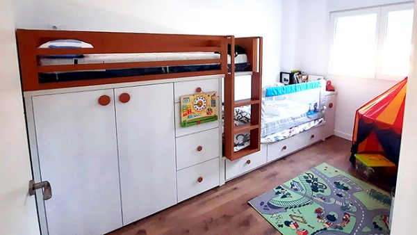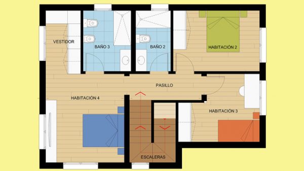 - Forjado de planta piso, en caso de existir dos plantas, compuesto por tablilla de 19 mm o yeso presado por debajo de las vigas, barrera de vapor fijado todo ello a la viga. Entre las vigas lana de roca de 50 mm (puede solicitarse mayor aislante). Por la parte superior de las vigas se fijará la tarima de 28 mm. (Opcionalmente puede instalarse parquet sintético AC5).