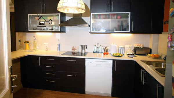 Cocina. La cocina va equipada con muebles altos y bajos. Existen varios modelos a elegir. Se instalará placa vitrocerámica eléctrica o bien de 4 fuegos a gas, campana extractora, horno eléctrico y fregadero, todo ello de la casa Teka o similar, en acabado metálico. Sobre la encimera posformada se alicatarán azulejos entre los armarios altos y bajos.
