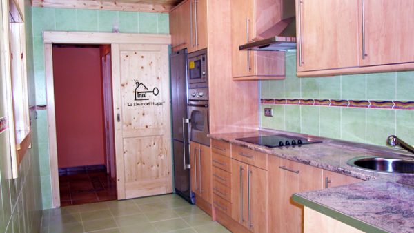 Cocina. La cocina va equipada con muebles altos y bajos. Existen varios modelos a elegir. Se instalará placa vitrocerámica eléctrica o bien de 4 fuegos a gas, campana extractora, horno eléctrico y fregadero, todo ello de la casa Teka o similar, en acabado metálico. Sobre la encimera posformada se alicatarán azulejos entre los armarios altos y bajos.
